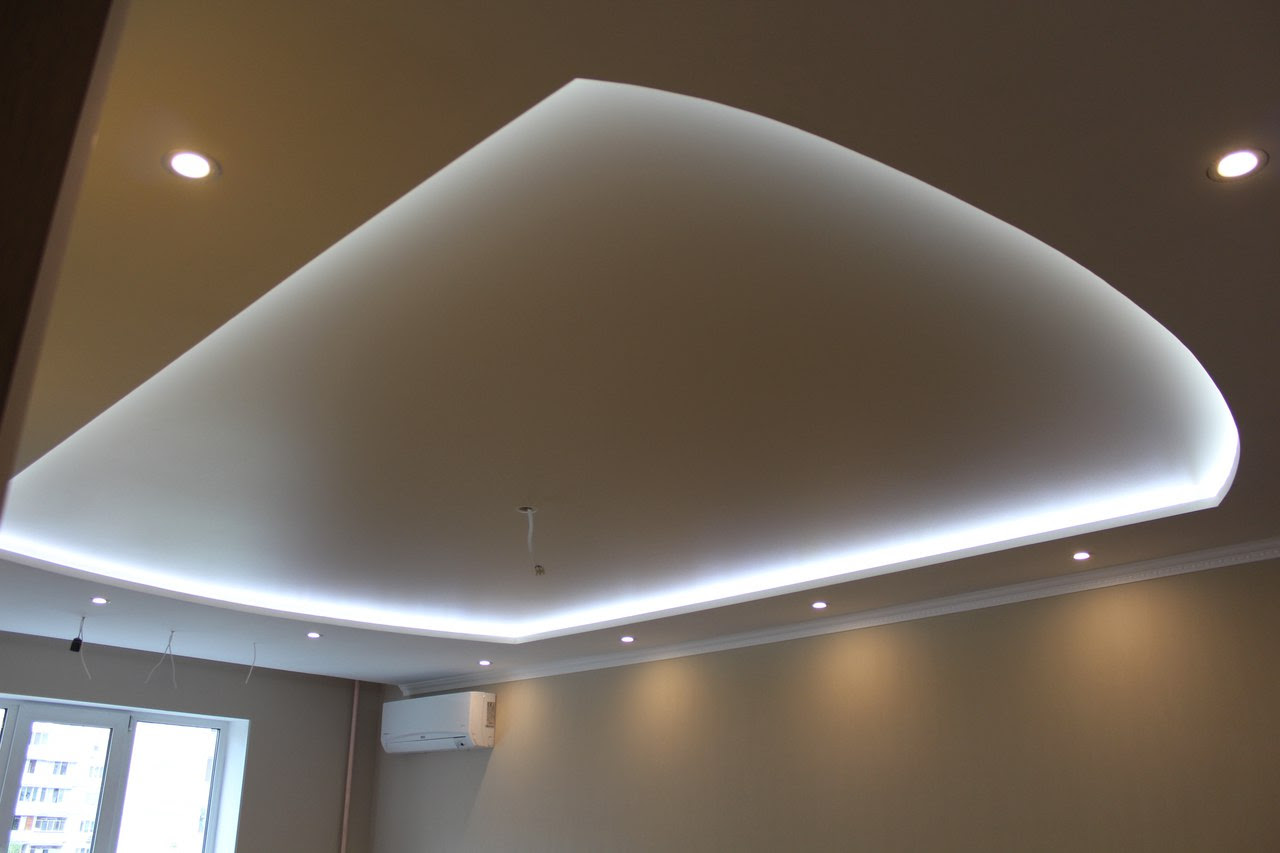 Натяжные потолки можно делать с диодной подсветкой, а так же вмонтировать в них абсолютно любые люстры,